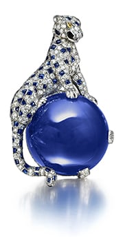 プラチナ、ホワイトゴールド、カシミール産サファイア カボション(152.35カラット)、シングルカット ダイヤモンド、ペアシェイプ イエローダイヤモンド2個(目)、サファイア カボション(パンテールの斑点)
