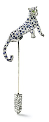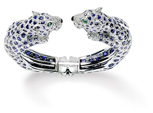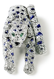 プラチナ、ホワイトゴールド、ブリリアントカット/シングルカット ダイヤモンド、 サファイア カボション(パンテールの斑点)、 マーキスカット エメラルド(目)、オニキス(鼻)