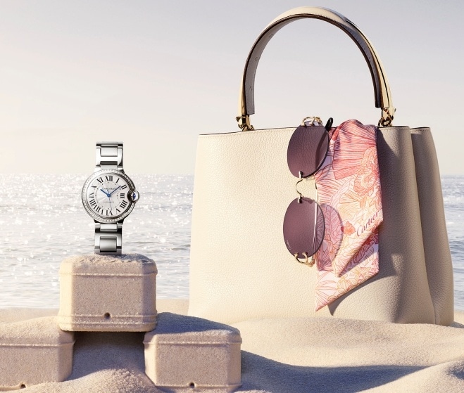輝くジュエリー、風に揺れるスカーフ、バカンスの時を刻むウォッチたち。今年の夏をカルティエはスタイリッシュに彩ります。