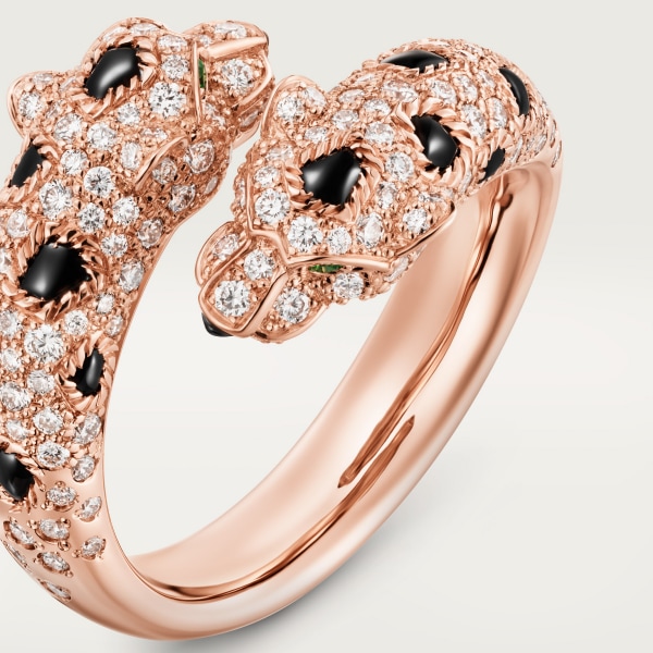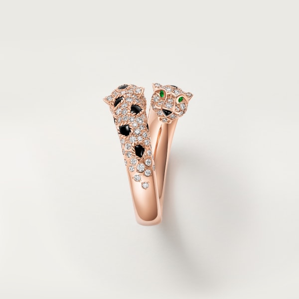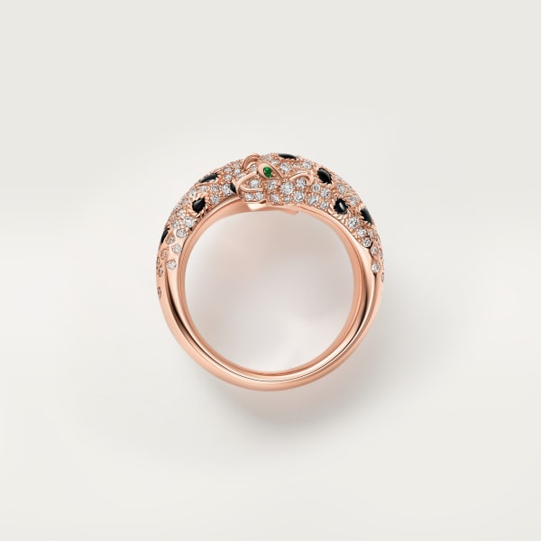 パンテール ドゥ カルティエ リング、ピンクゴールド750/1000、オニキス、エメラルド2石、ブリリアントカット ダイヤモンド174石(計0.92ct)(サイズ:52)。