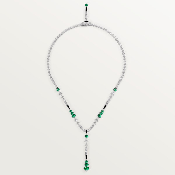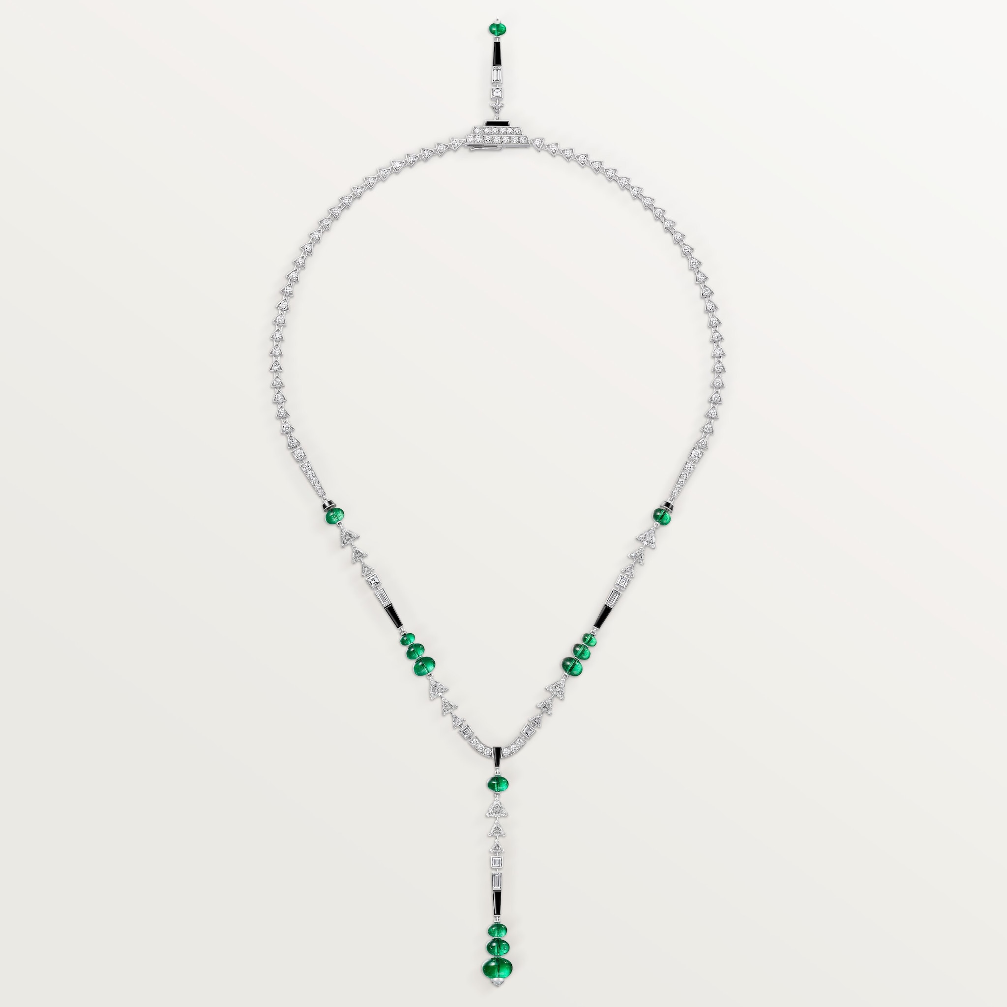 アン エキリーブル ネックレス、ホワイトゴールド750/1000、オニキス、エメラルドビーズ各13個、トロイディアカット ダイヤモンド16個(計3.34cts)、スクエアカット ダイヤモンド6個(計0.56ct)、バゲットカット ダイヤモンド4個(計0.46ct)、ブリリアントカット ダイヤモンド85個(計2.97ct)。