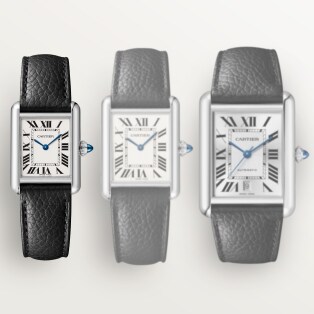 タンク マスト ウォッチ、スモールモデル、高効率クォーツムーブメント。ステンレススティール製ケース、パール状の飾り付きリューズにシンセティックスピネル カボション、シルバーダイアル、ブルースティール製剣型針、グレイン仕上げブラックカーフスキンストラップ、ステンレススティール製アルディロンバックル。ケースサイズ:29.5mm x 22mm、厚さ:6.6mm。日常生活防水。